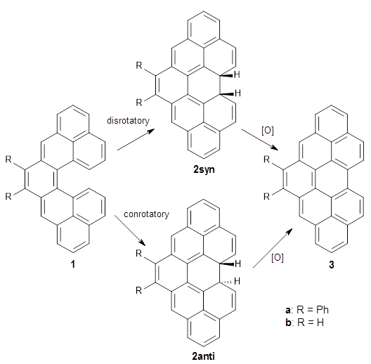 First, Solomek, Ravat, Mou, Kertesz, and Jurícek reported on the thermal and photochemical electrocyclization reaction of diphenylcetherene 1a.1 Though they were not able to directly detect the intermediate 2, through careful examination of the photochemical reaction, they were able to infer that the thermal cyclization goes via the formally forbidden conrotatory pathway (see Scheme 1).