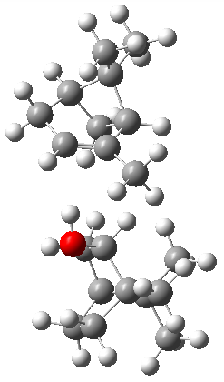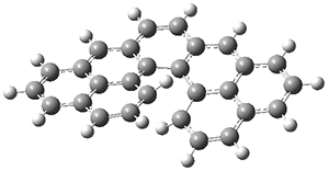 While this paper has little computational work, it is of interest to readers of this blog since I have discussed many aspect of aromaticity. This new tetracene is notable for its large twisting along the tetracene axis: about 97° in the x-ray structure. I have optimized the structure of 1 at B3LYP-D3(BJ)/6-311G(d) and its structure is shown in Figure 1. It is twisted by about 94°. The computed and x-ray structures are quite similar, as seen in Figure 2. Here the x-ray structure is shown with red balls, the computed structure with gray balls, and hydrogens have been removed for clarity.