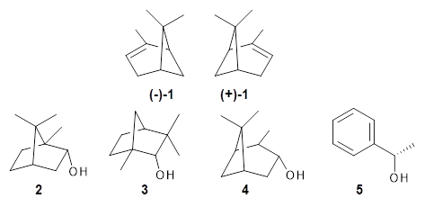 Can vibrational spectroscopy be used to identify stereoisomers? Medel, Stelbrink, and Suhm have examined the vibrational spectra of (+)- and (-)-α-pinene, (±)-1, in the presence of four different chiral terpenes 2-5.1 They recorded gas phase spectra by thermal expansion of a chiral α-pinene with each chiral terpene.