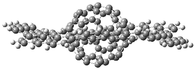 I also examined the complex of the flat macrocycle 6 (and its isomers) with a [5,5]-nanotube, 7. The tube bends over to create better dispersion interaction with the ring, which also become somewhat non-planar to accommodate the tube. Though not mentioned in the paper, I like to refer to 7 as Beyoncene, in tribute to All the Single Ladies.