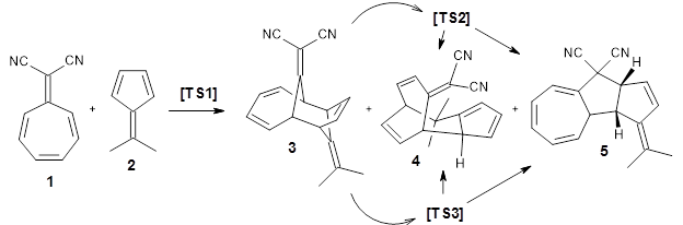They identified one transition state originating from the reactants TS1. Hypothesizing that it would be trispericyclic, they performed a molecular dynamics study with trajectories starting from TS1. They ran a total of 142 trajectories, and 87% led to 3, 3% led to 4, and 3% led to 5. This demonstrates the unusual nature of TS1 and the dynamic effects on this reaction surface.