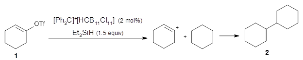 They find that vinyl triflates and cyclic vinyl triflates will react with [Ph3C]+[HCB11Cl11] and triethylsilane to generate vinyl cations that can then be trapped through a C-H insertion reaction. For example, cyclohexenyl triflate 1 reacts in a cyclohexane solvent to give the insertion product 2.