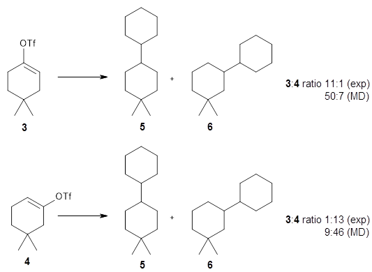 The reactions of isomers 3 and 4 give different ratios of the two products 5 and 6. In both cases, the cyclohexyl is trapped predominantly at the site of the triflate substituent. This means that the mechanism cannot involve a cyclohexene intermediate, since then the two ratios should be identical.