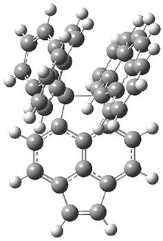 Their M062-x/6-31G* computations predict an increasing longer C-C bond (highlighted in blue in the above drawing): 1.730 Å in 1, 1.767 Å in 2, and 1.771 Å in 3. The structure of 3 is shown in Figure 3.