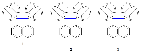 This is a third post in a series dealing with very short or very long distances between atoms. Ishigaki, Shimajiri, Takeda, Katoono, and Suzuki have prepared three related analogues of hexaphenylethane that all have long C-C bonds.1 The idea is to create a core by fusing two adjacent phenyls into a naphylene, and then protect the long C-C bond through a shell made up of large aryl groups, 1. Fusing another 5-member ring opposite to the stretched C-C bond (2) creates a scissor effect that should stretch that bond further, even more so in the unsaturated version 3.