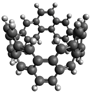 The PES is significantly simpler for the structure lacking the t-butyl groups, 2. The B3LYP/6-31G PES of 2 has the saddle as the transition state interconverting mirror images of the twisted saddle isomer, and this barrier is only 1.8 kcal mol-1. Figure 1 displays the twisted saddle and the saddle transition state. Clearly, the t-butyl groups significantly alter the flexibility of this C86 aromatic surface. One should be somewhat concerned about the small basis set employed here, especially lacking polarization functions, and a functional that lacks dispersion correction. However, the computed geometry of 1 is quite similar to that of the x-ray structure.