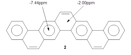 The fourth and last paper describes the aza-buckybowl 9.5 The x-ray crystal structure shows a curved bowl shape with Cs symmetry. NICS(0) values were computed for the parent molecule 10 B3LYP/6-31G(d). These values are shown in Scheme 1 and the geometry is shown in Figure 4. The 6-member rings that surround the azacylopentadienyl ring all have NICS(0) near zero, which suggests significant bond localization.