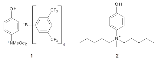 A key recognition was that a charged substituent (like say ammonium) has a much larger effect on the gas-phase (and non-polar solvent) acidity than on the acidity in a polar solvent, like DMSO. This can be attributed to the lack of a medium able to stable charge build-up in non-polar solvent or in the gas phase. This led them to 1, for which B3LYP/6-31+G(d,p) computations of the analogous dipentyl derivative 2 (see Figure 1) indicated a deprotonation free energy of 261.4 kcal mol-1, nearly 60 kcal mol-1 smaller than any other substituted phenol they previously examined. Subsequent measurement of the OH vibrational frequency shift showed the largest shift, indicating that 1 is extremely acidic in non-polar solvent.