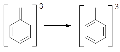 stabilization energy (ISE)5 compares an aromatic (or antiaromatic) compound against a non-aromatic reference, one that typically is made by appending an exo-methylene group to the ring. So, to assess the ISE of the T1 state of benzene, Reaction 1 is used. (Note that the inherent assumption here is that the stabilization energy of benzene is essentially identical to that of toluene.) At B3LYP/6-311++G(d,p) the energy of Reaction 1 is +13.5 kcal mol-1. This reaction should be corrected for non-conservation of s-cis and s-trans conformers by adding on the energy of Reaction 2, which is +3.4 kcal mol-1. So, the ISE of triplet benzene is +16.9 kcal mol-1, indicating that it is antiaromatic. In contrast, the ISE for triplet cyclooctatetraene is -15.6 kcal mol-1, and when corrected its ISE value is -24.7 kcal mol-1, indicating aromatic character. These are completely consistent with Baird’s rule. Schleyer also presents an excellent correlation between the computed ISE values for the triplet state of 9 monocyclic polyenes and their NICS(1)zz values.