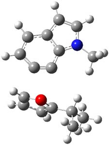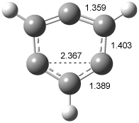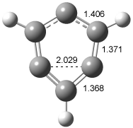 The concreted and stepwise transition states for this reaction (at (U)M06-2X/6-311+G(d,p)) are shown in Figure 2. The concerted barrier is 36.0 kcal moml-1 while the stepwise barrier is slightly lower: 35.2 kcal mol-1. The distortion energy for the concerted reaction is large (43.2 kcal mol-1) due mostly to angle changes in the diyne. Its interaction energy is -7.2 kcal mol-1, similar to the interaction energy in other similar Diels-Alder reactions. In contrast, the distortion energy for the stepwise pathway is 27.5 kcal mol-1, but the interaction energy is +7.7 kcal mol-1. These values are very similar to the distortion and interaction energy of the related (but less saturated DA reactions).