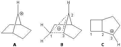 A long sought-after data point critical to the non-classical cation story has finally been obtained. The elusive x-ray crystal structure of a norbornyl cation was finally solved.1 The [C7H11]+[Al2Br7]– salt was crystallized in CH2Br2 at low temperature (40 K). This low temperature was needed to prohibit rotation of the norbornyl cation within the crystal (the cation is near spherical and so subject to relatively easy rotation within the crystal matrix) and hydride scrambling among the three carbons (C1, C2, and C6) involved in the non-classical cation structure.