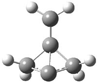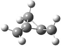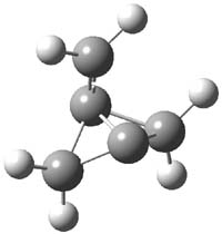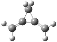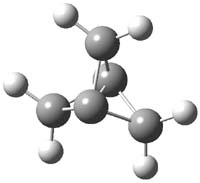 Propellane 1, whose bridgehead-bridgehead bond has been a topic of an earlier post, has a HOMO that is largely outside of the bridgehead-bridgehead region. Thus, loss of an electron to form the radical cation 1.+ seems unlikely to lead to any significant geometrical change. However, the ESR of the radical cation of propellane shows two types of hydrogens, one type of four hydrogens and a second type of two hydrogens. This is incompatible with a D3h structure similar to that of 1. Furthermore, loss of an electron from dimethylenecyclopropane 2 leads to a species whose ESR is nearly identical to that of the radical cation of propellane. Analysis of the ESR suggests that the radical actually produced is 3.+.