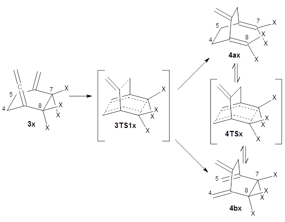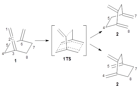 Kinetic studies estimate the activation barrier is 14.1 kcal mol-1. They performed DFT computations of the parent 1b using a variety of functionals with both restricted and unrestricted wavefunctions. The allowed pathway to 2syn is predicted to be greater than 27 kcal mol-1, while the formally forbidden pathway to 2anti is estimated to have a lower barrier of about 23 kcal mol-1. The two transition states for these different pathways are shown in Figure 1, and the sterics that force a helical structure to 1 help make the forbidden pathway more favorable.