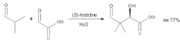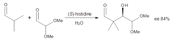 Houk in collaboration with Scheffler and Mahrwald investigate the use of histidine as a catalyst for the asymmetricaldol reaction.3 Examples of the histidine-catalyzed aldol are shown in Reactions 5-7.