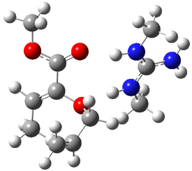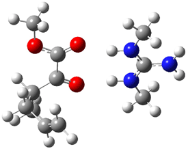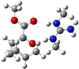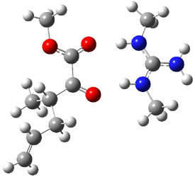 B3LYP/6-31G(d,p) computations provide some insight. The uncatalyzed reaction of 1 to give 2 is predicted to be exothermic by 16.1 kcal mol-1, with an activation energy of 25.9 kcal mol-1. Using N,Nā-dimethylguanidnium as a model for the catalyst (and with no counter anion and no treatment of solvent ā hexanes in this case), they find a complexation energy of almost 27 kcal mol-1 for forming 3. 3 exhibits (See Figure 1) three hydrogen bond-like interactions ā one N-H bifurcates to interact with the carbonyl oxygen and (a very long interaction) to the other oxygen. The product complex 4 also shows three hydrogen bond-like interactions, with an overall exothermicity of -14.7 kcal mol-1. The complexed transition state 5 has two normal length hydrogen bonds, with an activation energy above 3 of 20.6 kcal mol-1. Thus the complex lowers the barrier by about 5 kcal mol-1, indicating the catalytic effect. They have not however addressed the enantioselectivity.