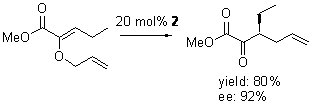 Jacobsen reports another interesting example of organocatalysis, here using a chiral guanadinium salt to catalyze the enantioselective Claisen rearrangement.1 As an example, Reaction 1 proceeds in 6 days at 30 °C to give 81% yield with an ee of 84%. The system is also diastereoselective, so that Reaction 2, run for 6 days at 40 °C, gives an 82% yield with a diastereomeric ratio of 16:1 and an ee of 81%.