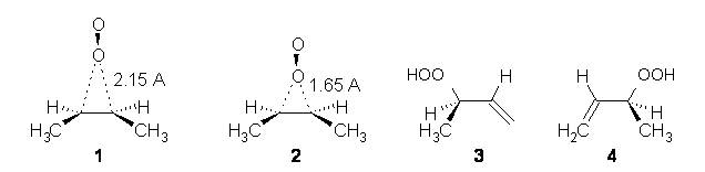 Their work begins by careful reassessment of the computational study of Singleton, Foote and Houk.2 These authors looked at the reaction of singlet oxygen with cis-2-butene by creating a 15×15 gird of optimized geometries holding the C-O distance fixed to specific values while letting the other geometric variables completely relax (see 1). These geometries were obtained at B3LYP/6-31G* and single-point energies were then obtained at CCSD(T)/6-31G*. They find two transiti0n states, one corresponding to symmetric addition of oxygen to the alkene 2 which leads to the pereperoxide 3. However, this pereperoxide 3 is not an intermediate, but rather a transition state for interconversion of the ene products 4 and 5. These structures and mechanism appear consistent with the experimental kinetic isotope effects. The authors characterize the reaction as “two-step no-intermediate”. Essentially, the reactants would cross the first transition state 1, encounter a valley-ridge inflection point that bifurcates reaction paths that go to either 3 or 4 and avoid ever reaching the second transition state 2.