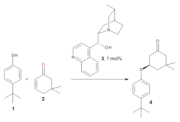 (1) Hiemstra, H.; Wynberg, H. "Addition of aromatic thiols to conjugated cycloalkenones, catalyzed by chiral .beta.-hydroxy amines. A mechanistic study of homogeneous catalytic asymmetric synthesis," J. Am. Chem. Soc. 1981, 103, 417-430, DOI: 10.1021/ja00392a029.