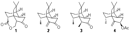 Stephens and the Gaussian personnel developed the techniques for computing optical rotation, electronic circular dichroism (ECD) and vibrational circular dichroism (VCD).1-4 Over the past year, Stephens has implemented a protocol for computing these properties in order to determine the absolute configuration of a chiral molecule.5-7 The first application was to the structures of the related sesquiterpenes 1-4.5 A Monte Carlo conformational search is first carried out using MMFF94, and all low energy conformers are reoptimized at B3LYP/6-31G*. Restricted searches by varying some dihedral angles are also sometimes used to insure that all reasonable low-energy conformations have been identified. Then, using these optimized geometries,specific rotations and ECD are computed at TDDFT/B3LYP/aug-cc-pVDZ, and IR and VCCD spectra computed at B3LYP and B3PW91 with the TZ2P basis set.