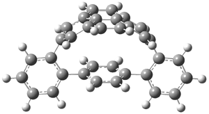 The novel cyclophanes 1 and 2 have now been synthesized.1 An interesting question is whether the bent pyrenes portion of the two molecules remains aromatic. The bending angles is 93.8° in 1 and 95.8° in 2. This distortion is readily apparent in Figure 1, which presents their B3LYP/6-311G(d,p) optimized geometries. NICS computations were used to assess the aromaticity of the pyrene portion. The central rings of pyrene have NICS(0) = -4.4 ppm. The corresponding values in 1 and 2 are -4.5 ppm. The apical rings of pyrene have NICS(0)= -11.9 ppm, while the value is -11.1 ppm in 1 and -11.0 ppm in 2. These calculations indicate that the molecule retains much of the aromaticity of the parent pyrene despite the significant out-of-plane distortions.