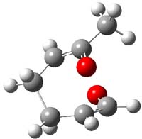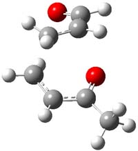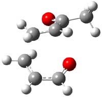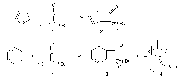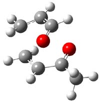 Dynamic effects rear up yet again in a seemingly simple reaction. Singleton has examined the Diels-Alder cycloaddition of acrolein with methyl vinyl ketone to give two cross products 1 and 2.1 Upon heating the product mixture, 1 is essentially the only observed species. The retro-Diels-Alder is much slower than the conversion of 2 into 1. Using a variety of rate data, the best estimate for the relative formation of 1:2 is 2.5.