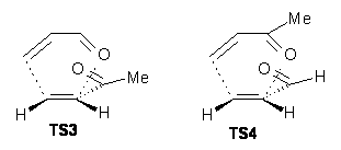 The eight possible transition states for this reaction were computed with a variety of methodologies, all providing very similar results. The lowest energy TS is TS3. A TS of type TS4 could not be found; all attempts to optimize it collapsed to TS3.