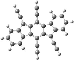 The search for ever more intriguing aromatic/antiaromatic species continues on – Haley has recently prepared the TIPS-protected indeno[1,2-b]fluorene 1. 1 The crystal structure was determined and analogue with the tri-iso-propylsilyl groups replaced with hydrogens (2) has been computed at B3LYP/6-31G(d,p). This optimized structure is shown in Figure 1. The core system has 20 π-electrons – suggesting perhaps an antiaromatic system.