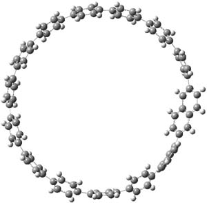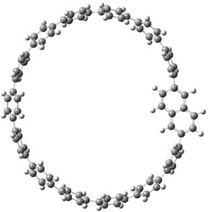 Itami has synthesized 2 (having 13 phenyl groups and one naphthyl group) and also examined the ring strain energy and racemization energy of a series of these types of compounds at B3LYP/6-31G(d). As might be expected, based on studies of the cycloparaphenylenes themselves,2,3 ring strain energy decreases with increasing size of the macrocycle. So, for example, the macrocycle with one naphthyl group and 5 phenyl rings has a strain energy of 90 kcal mol-1, but the strain is reduced to 40 kcal mol-1 with 13 phenyl rings.