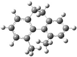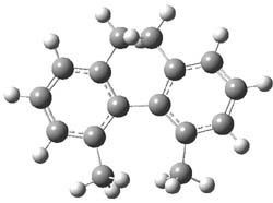 The macrocycle 2 and related structures are chiral, existing in P and M forms. The racemization involves first rotation of the naphthyl group, as shown in Figure 1, with a barrier of about 8 kcal mol-1. The direct product has the opposite stereochemistry but is not in the lowest energy conformation. Rotations of some phenyl groups remains to occur, but these rotations are expected to have a barrier less than that for the rotation of the naphthyl group, based on the previous study of cycloparaphenylenes. Again, the racemization barrier decreases with the size of the macrocycle.