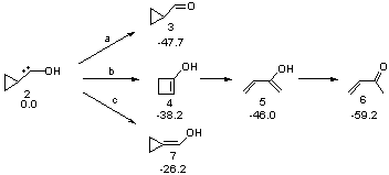 Schreiner makes this carbene in his usual manner: flash pyrolysis of the cyclopropylglyoxylic acid. Let’s now consider three possible rearrangements of carbene 2. The hydrogen can migrate (Scheme 1, path a) to give cyclopropylcarboxyaldehyde 3 similar to what was observed with the related hydroxycarbenes. Carbon can migrate (Scheme 1, path b), opening up the three-member ring to give the cyclobutenol 4. This ring could open to the diene 5 and tautomerize to the ketone 6. Lastly, a hydrogen migration from carbon (Scheme 1, path c) would lead to 7. The relative energies of these species computed at CCSD(T)//cc-pVTZ//M06-2x//6-311++G(d,p) are shown in Scheme 1.