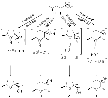The results are summarized in Figure 1. Basically, as expected by Baldwin’s rules, the closure to the tetrahydrofuran (5-exo-tet) is favored under both catalyzed conditions. However, the preference is small under base conditions, with the difference in the free energy of activation of only 1.2 kcal mol-1.