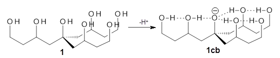 Can a hydrogen bonding network affect acidity? Kass has examined the polyol 1 whose conjugate base 1cb can potentially be stabilized by a large hydrogen bonding network.1 Kass had previously found a significant acidy enhancement in comparing t-butanol (ΔG(deprotonation) = 369.2 kcal mol-1) with that of 2 (ΔG(deprotonation) = 334.4 kcal mol-1).2