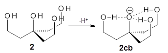 The difference in the acidity of t-butanol and 2, some 30 kcal mol-1, reflects the stability afforded by three intramolecular hydrogen bonds to the oxyanion. In going from 2cb to 1cb, each of the hydroxyl groups that donate to the oxyanion act as the acceptor of a hydrogen bond from the more removed hydroxyl groups. There is in effect a first and second layer of hydrogen bond network in 1cb. These secondary hydrogen bonds lead to further stabilization of the anion, as reflected in the diminished DPE of 1 over 2: 320.2 vs. 335.0 kcal mol-1. Note that this secondary layer does not stabilize the anion to the same degree as the primary layer, but nonetheless its effect is large and quite striking.