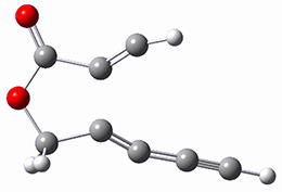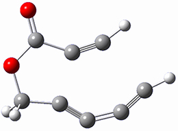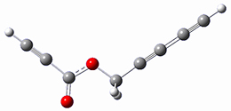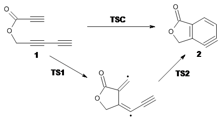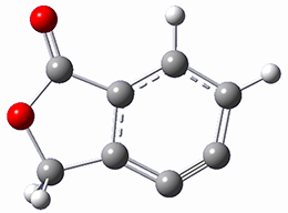 NICS computations where made in the centers of each of the two rings formed by the large macrocycle and the bridging phenyl group (sort of in the centers of the two lenses of the eyeglass). The NICS values for 1 are about -15ppm, indicative of aromatic character, while they are about +15ppm for 2, indicative of antiaromatic character. However, for the triplet states, the NICS values change sign, showing the aromatic character reversal between the ground and excited triplet state. The aromatic states are also closer to planarity than the antiaromatic states (which can be seen by clicking on the images in Figure 1, which will launch the JMol applet so that you can rotate the molecular images).