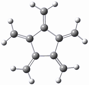 These computations drove the synthesis of 1 by coordinating it to two equivalents of Fe(CO)3 and then driving off the metals with cerium ammonium nitrate in acetone at -78 °C. The free [5]radialene was then detected by NMR, and it decomposes with a half-life of about 16 min at -20 °C.