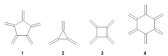 What may be something of a surprise, [5]radialene 1 has only just now been synthesized.1 What makes this especially intriguing is that [3]radialene 2, [4]radialene 3 and [6]radialene 4 have been known for years.
