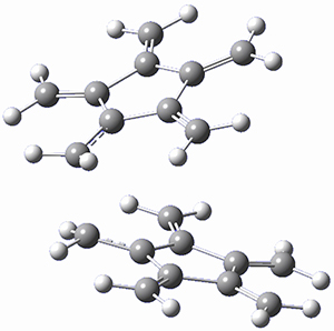 Paddon-Row, Sherburn, and coworkers speculated that [5]radialene must undergo polymerization much more rapidly than the other radialenes. They computed the activation barrier for the Diels-Alder dimerization of the radialenes at G4(MP2). (The optimized structure of 1 and the transition state for the dimerization of 1 are shown in Figure 1.) The activation barrier for the dimerization of 1 is computed to be only 14.3 kJ mol-1, much lower than for the dimerization of 3 (59.2 kJ mol-1) or 4 (31.5 kJ mol-1).