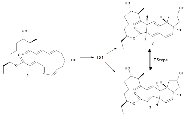 Reactant 1, transition states, and products 2 and 3 were optimized at SMD(H2O)/M06-2X/def2-TZVPP//B3LYP-D3(BJ)//6-31+G(d,p). Geometries and relative energies are shown in Figure 1. The reaction 1 → 2 is a formal [6+4] cycloaddition, and the reaction 1 → 3 is a formal [4+2] cycloaddition. Interestingly, only a single transition state could be located TS1. It is a bispericyclic TS (see Chapter 4 of my book), where these two pericyclic reaction sort of merge together. After TS1 is traversed the potential energy surface bifurcates, leading to 2 or 3. This is yet again an example of a single TS leading to two different products. (See the many posts I have written on this topic.) The barrier height is 27.6 kcal mol-1, with 2 lying 13.1 kcal mol-1 above 3. However, the steepest descent pathway from TS1 leads to 2. There is a second transition state TScope that describes a Cope rearrangement between 2 and 3. Using the more traditional TS theory description, 1 undergoes a [6+4] cycloaddition to form 2 which then crosses a lower barrier (TScope) to form the thermodynamically favored 3, which is the product observed in the enzymatically catalyzed reaction.