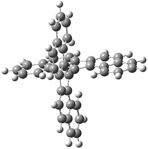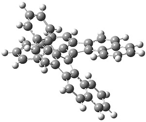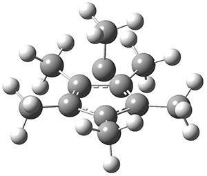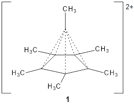 The molecule is prepared by first epoxidation of hexamethyl Dewar benzene, followed by reaction with Magic acid, and crystallized by the addition of HF. The crystal structure shows a pentamethylcyclopentadienyl base capped by a carbon with a methyl group. The x-ray structure is well reproduced by the B3LYP/def2-TZVP structure shown in Figure 1. (While this DFT method predicts a six-member isomer to be slightly lower in energy, MP2 does predict the cage as the lowest energy isomer.)