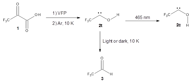 The Schreiner group has again reported an amazing experimental and computational study demonstrating a fascinating quantum mechanical tunneling effect, this time for the trifluoromethylhydroxycarbene (CF3COH) 2.1 (I have made on a number of posts discussing a series of important studies in this field by Schreiner.) Carbene 2 is formed, in analogy to many other hydroxycarbenes, by flash vapor pyrolysis of the appropriate oxoacid 1 and capturing the products on a noble gas matrix.