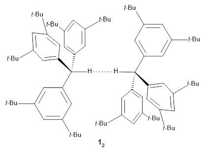 Following on previous work (see these posts on ladderane and hexaphenylethane), Schreiner, Grimme and co-workers have examined the structure of the all-meta tri(di-t-butylphenyl)methane dimer 12.1 In the study of hexaphenylethane,2 Schreiner and Grimme note that t-butyl groups stabilize highly congested structures through dispersion, identifying them as “dispersion energy donors”.3 The idea here is that the dimer of 1 will be stabilized by these many t-butyl groups. In fact, the neutron diffraction study of the crystal structure of 12 shows an extremely close approach of the two methane hydrogens of only 1.566 Å, the record holder for the closest approach of two formally non-bonding hydrogen atoms.