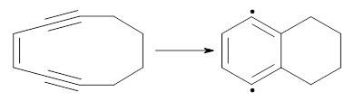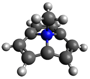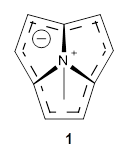 The range of aromatic compounds seems limitless. Mascal and co-workers have prepared the azatriquinacene 1 in a remarkably simple fashion.1 The molecule is a zwitterion, with the carbon atoms forming a 9-center, but 10 π-electron ring, and the quaternary nitrogen sitting above it. The carbon ring satisfies Hückel’s rule (4n+2) and so should be aromatic. The capping nitrogen should help to keep the carbon ring fixed in a shallow bowl.