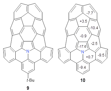 The fourth and last paper describes the aza-buckybowl 9.5 The x-ray crystal structure shows a curved bowl shape with Cs symmetry. NICS(0) values were computed for the parent molecule 10 B3LYP/6-31G(d). These values are shown in Scheme 1 and the geometry is shown in Figure 4. The 6-member rings that surround the azacylopentadienyl ring all have NICS(0) near zero, which suggests significant bond localization.
