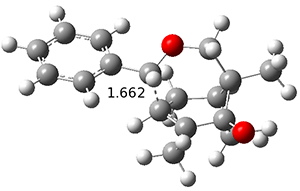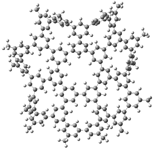The third paper presents a geodesic molecule based on 1,3,5-trisubstitued phenyl repeat units.4 The authors prepared 7, and its x-ray structure shows a saddle-shape. The NMR indicate a molecule that undergoes considerable conformational dynamics. To address this, they did some computations on the methyl analogue 8. The D7h structure is 309 kcal mol-1 above the local energy minimum structure, which is way too high to be accessed at room temperature. PM6 computations identified a TS only 0.6 kcal mol-1 above the saddle ground state. (I performed a PM6 optimization starting from the x-ray structure, which is highly disordered, and the structure obtained is shown in Figure 3. Unfortunately, the authors did not report the optimized coordinates of any structure!)